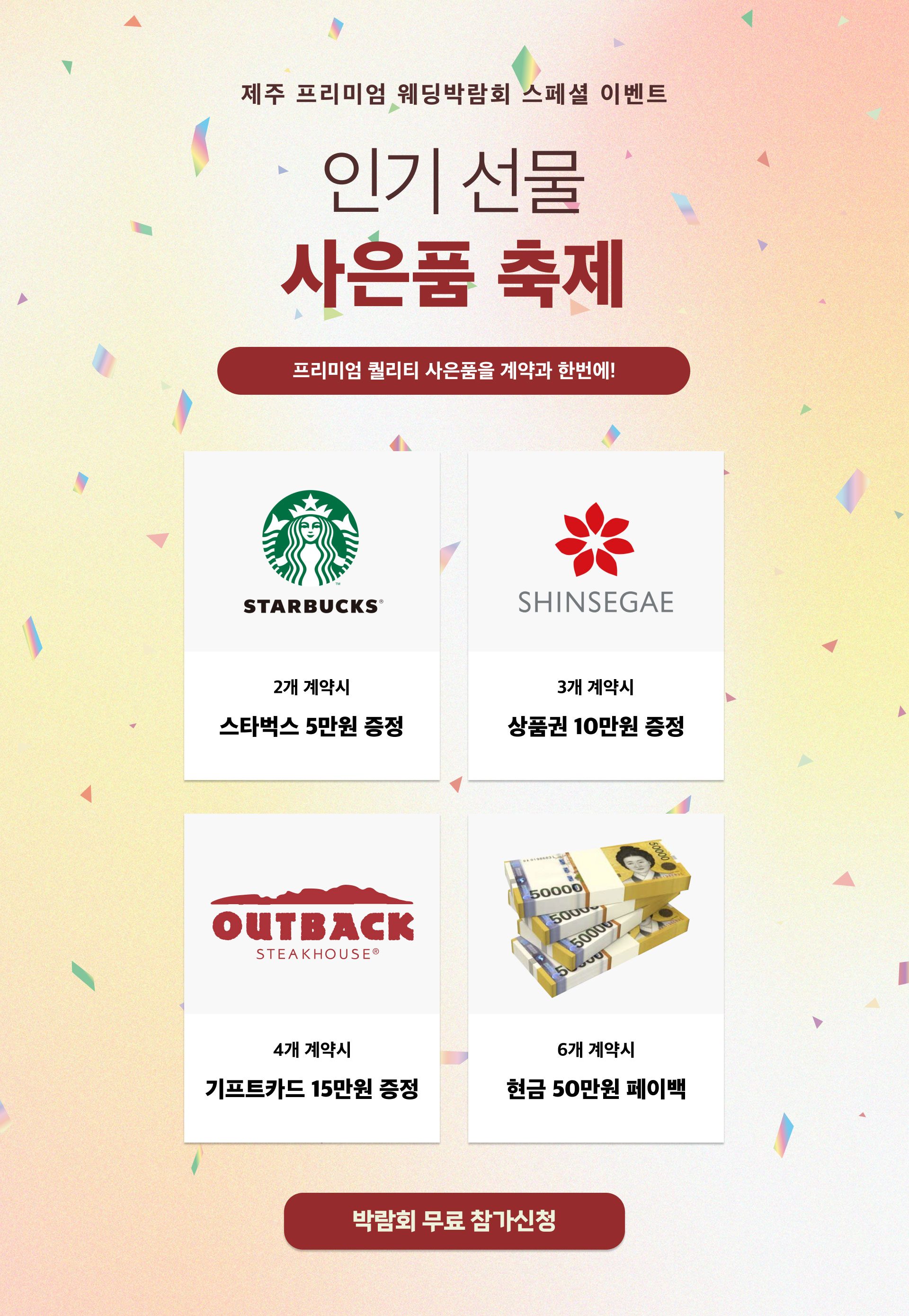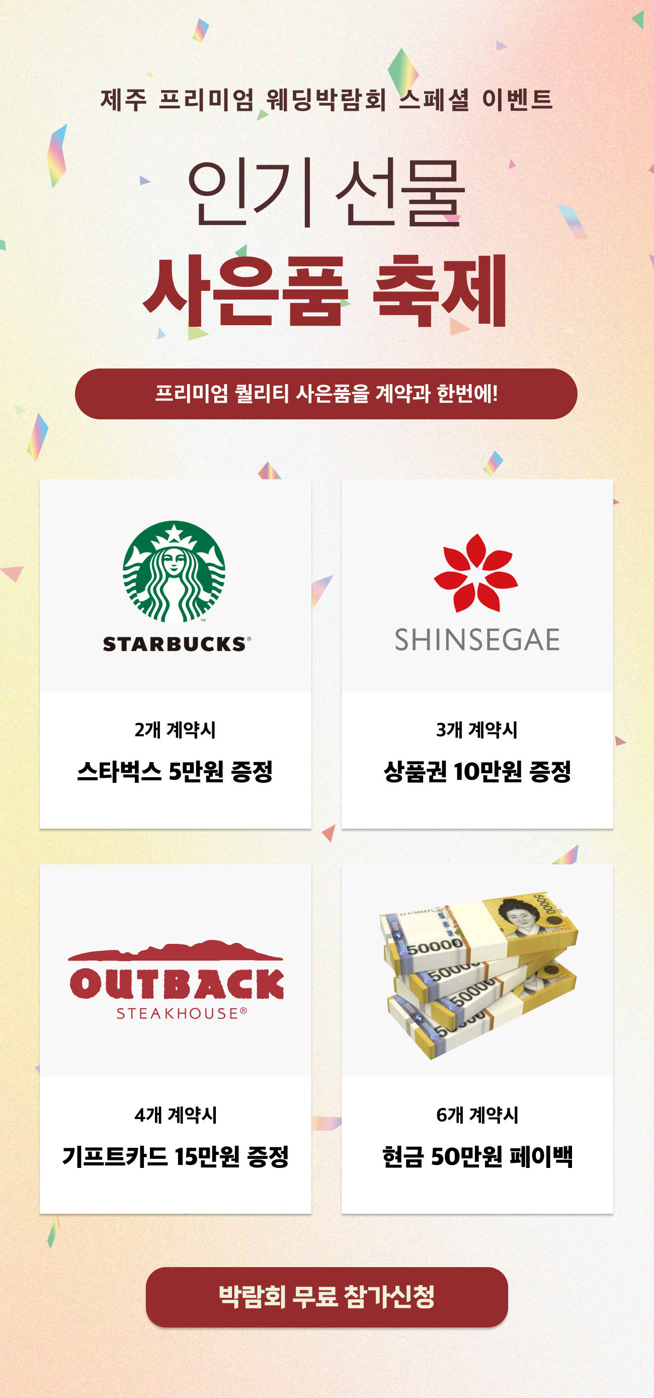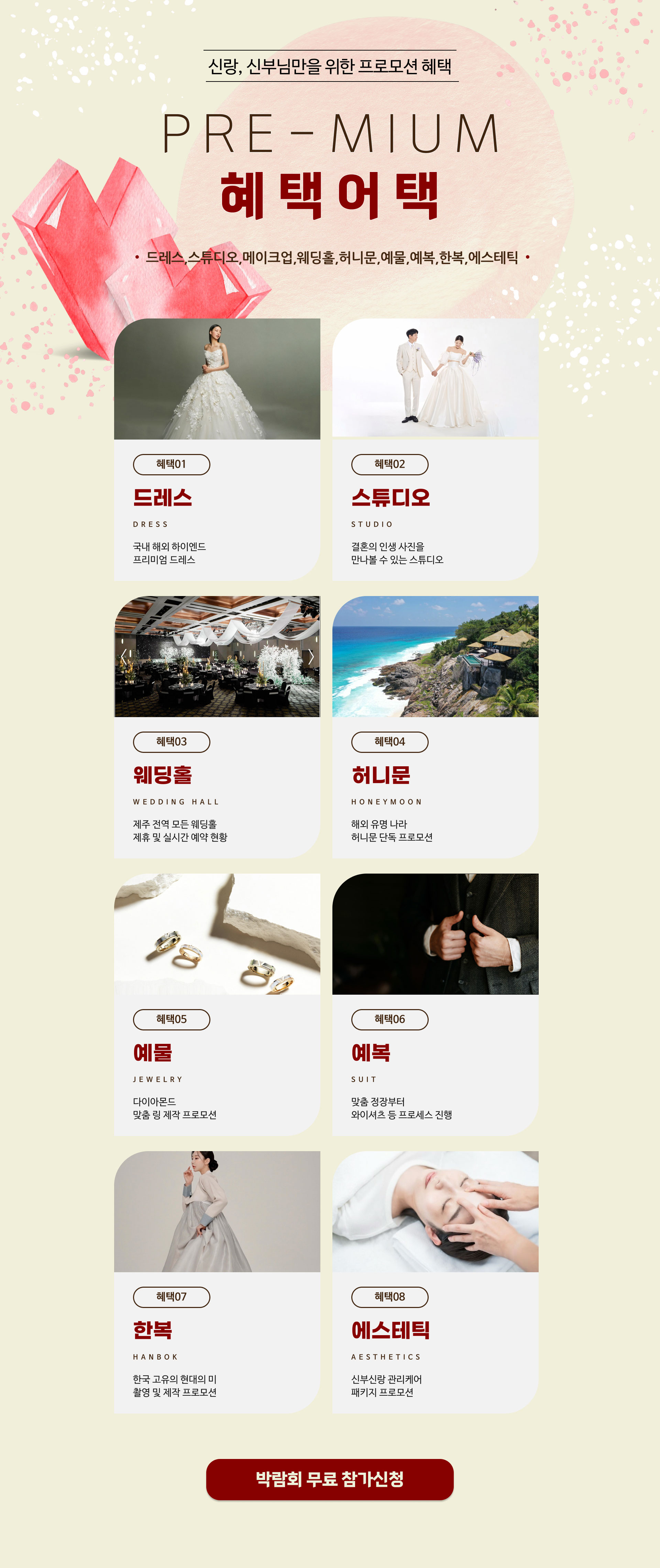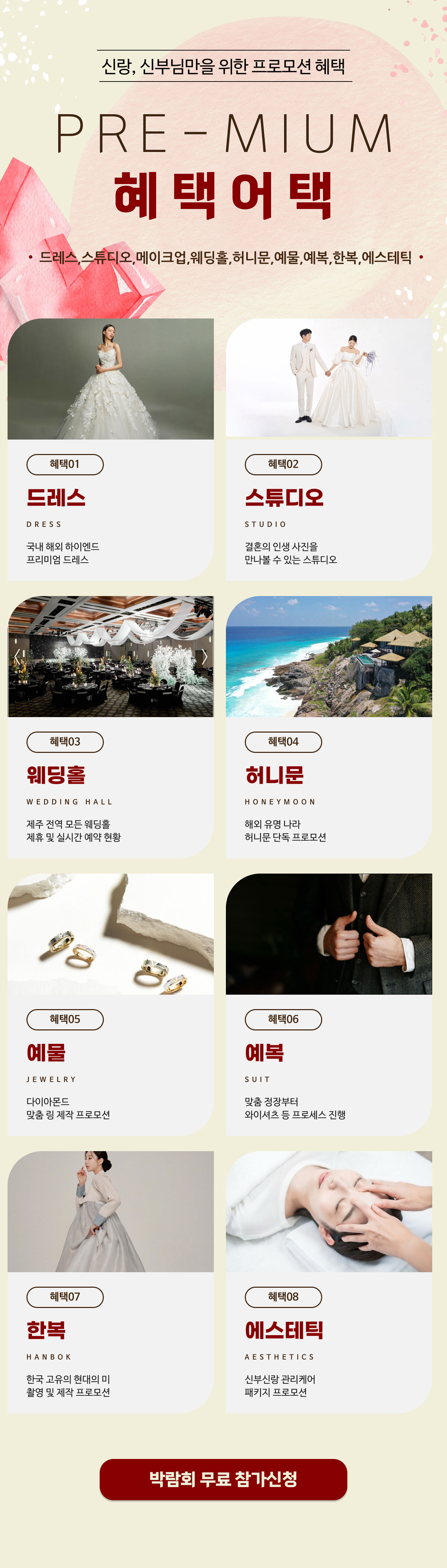 [개인정보의 보유 및 이용기간] - 원칙적으로 개인정보의 수집 또는 제공받은 목적 달성 시 지체 없이 파기합니다. - 다만, 원활한 서비스의 상담을 위해 상담 완료 후 내용을 3개월간 보유할 수 있으며 전자상거래에서의 소비자보호에 관한 법률 등 타법률에 의해 보존할 필요가 있는 경우에는 일정기간 보존합니다. 보존 항목 : 이름 , 성별 , 로그인ID , 비밀번호 , 비밀번호 질문과 답변 , 자택 전화번호 , 자택 주소 , 휴대전화번호 , 이메일 , 직업 , 회사명 , 회사전화번호 , 결혼여부 , 기념일 , 서비스 이용기록 , 접속 로그 , 쿠키 , 접속 IP 정보 , 결제기록 , 영문명 그리고 관계법령의 규정에 의하여 보존할 필요가 있는 경우 회사는 아래와 같이 관계법령에서 정한 일정한 기간 동안 회원정보를 보관합니다. 1) 계약 또는 청약철회 등에 관한 기록: 5년 2) 대금결제 및 재화 등의 공급에 관한 기록: 5년 3) 소비자의 불만 또는 분쟁처리에 관한 기록: 3년 [개인정보 제3자 제공 동의] 행사주관사 K-TOP웨딩은 개인정보보호법에 의거 귀하의 개인정보를 아래와 같이 제3자 제공하는 것에 대해 동의를 받고자 합니다. 1. 개인정보를 제공받는 자 : 삼성전자판매 주식회사 2. 제공하는 개인정보 항목 : 이름, 휴대폰 번호, 예식일, 입주일 3. 이용목적 : 혼수 가전 제품 관련 판촉행사 안내 등 (TM/MMS) 4. 보유 및 이용 기간 : 제공일로부터 10개월 ※ 귀하께서는 귀하의 개인정보를 제3자에게 제공하는 것에 대한 동의를 거부하실 수 있으나, 동의를 거부하실 경우 판촉행사 안내를 받으실 수 없습니다. [광고메시지 수신 동의] 삼성전자판매 주식회사에서 보내는 이벤트, 프로모션 등에 대한 다양한 소식을 휴대전화 문자메시지 등으로 받아보실 수 있습니다. 귀하는 언제든지 본 동의를 철회할 수 있습니다.